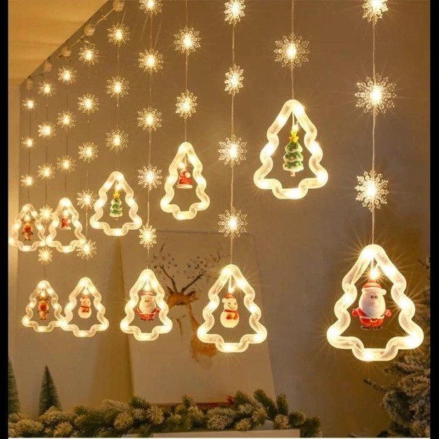 Гірлянда штора "Фігурки в ялинці" 3 метри (ялинка, сніговик, дід мороз, олень, шапка) Теплий