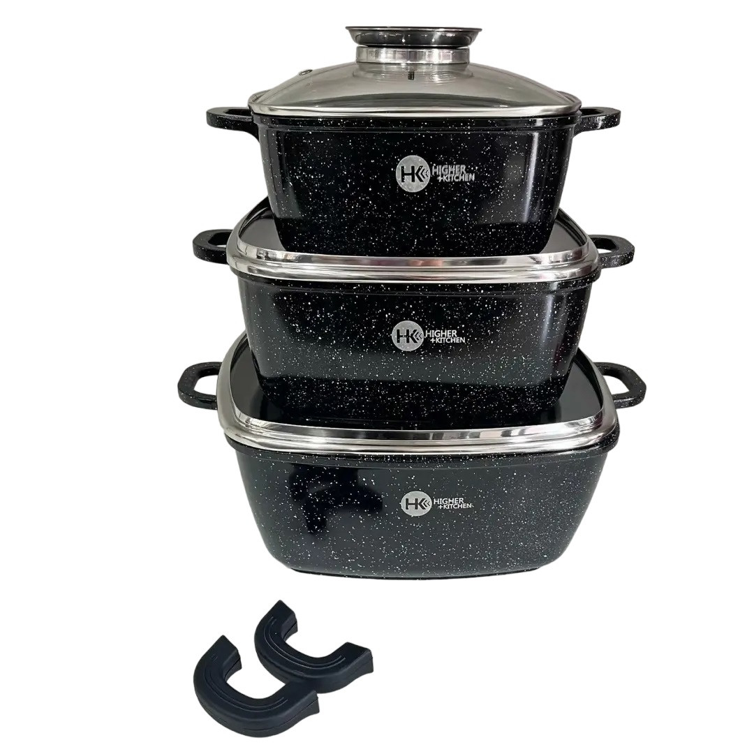 Казани Higher Kitchen складається з 3 квадратних котлів із гранітним антипригарним покриттям. Ця модель посуду — якісний варіант від компанії HIGH-Kitchen. Набір зроблений із міцного й екологічно чистого алюмінію — безпечного для здоров'я матеріалу, який не викликає алергію й не виділяє шкідливих речовин у їжу навіть за високої температури.